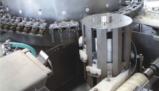 本機采用8~16工位步進式傳輸系統(tǒng),桌面式結(jié)構(gòu),自動完成從絞龍進瓶、前沖氮(或沖氣)、灌裝、后沖氮、預(yù)熱、拉絲封口到出瓶的全套生產(chǎn)過程。本機既能單機使用,也能與立式超聲波清洗機、殺菌干燥機組成聯(lián)動線使用。