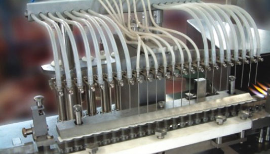 本機采用直線間歇式灌裝及封口。來自滅菌干燥機的安瓿瓶通過進瓶傳輸帶送至灌裝封口機絞龍部位,絞龍將無序狀態(tài)的安瓿瓶整理成有序的分離狀態(tài),并將安瓿瓶逐個地推進至進瓶撥輪,進瓶撥輪連續(xù)將安瓿瓶遞交給前行走梁部件,前行走梁部件再將安瓿瓶連續(xù)運動轉(zhuǎn)變?yōu)殚g歇運動方式送至中間行走梁然后將安瓿按步進方式依次送至下列5個工位:前充氮、灌液、后充氮、預(yù)熱、拉絲封口工位。在充氮工位,可以根據(jù)用戶各自產(chǎn)品的需要自行取舍,前充氮工位可設(shè)定為沖壓縮空氣,也可設(shè)定為沖其它惰性氣體,后充氮工位則設(shè)定為沖惰性氣體;在灌液工位,多個玻璃柱塞泵通過灌針將藥液注入安瓿,各灌裝泵裝量可通過調(diào)節(jié)手輪來調(diào)整;在預(yù)熱工位,安瓿瓶被火嘴吹出的液化氣與氧氣的混合燃燒氣體加熱,同時在滾輪的作用下產(chǎn)生自旋運動,在拉絲封口工位,安瓿頂部進一步受熱軟化被拉絲夾拉絲封口,封好口后的安瓿瓶經(jīng)出瓶撥輪被推入接瓶盤中,還可以根據(jù)客戶的要求配備氫氧混和氣作為燃氣。